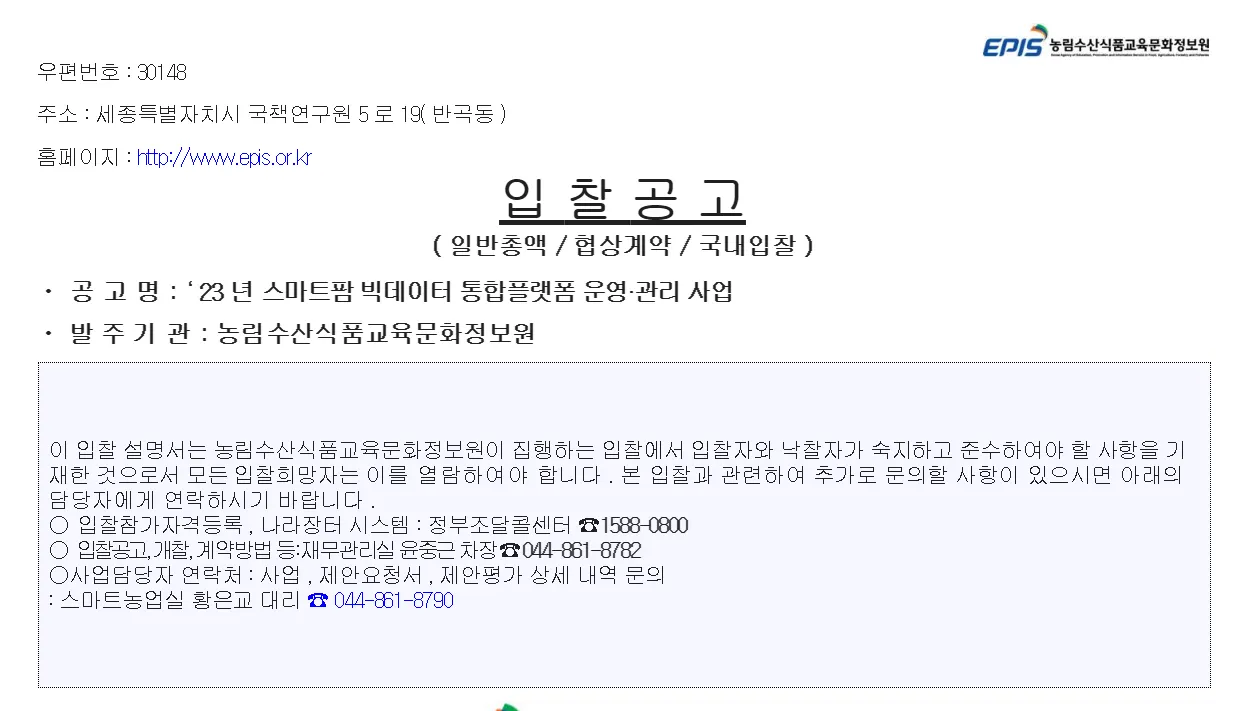 23년 스마트팜 빅데이터 통합플랫폼 운영 관리 사업은 농림축산식품부, 농림수산식품교육문화정보원의 스마트팜 빅데이터 통합플랫폼 운영 관리 사업 프로젝트입니다.
